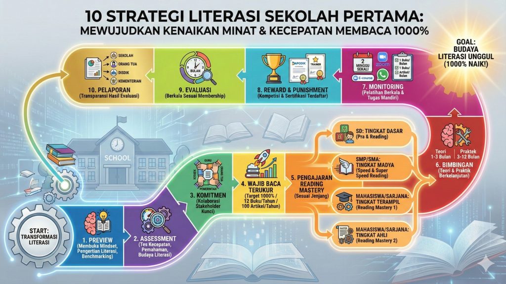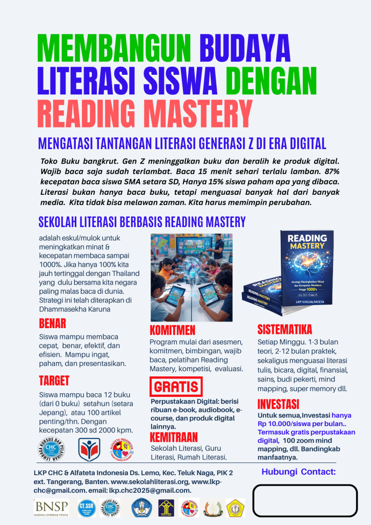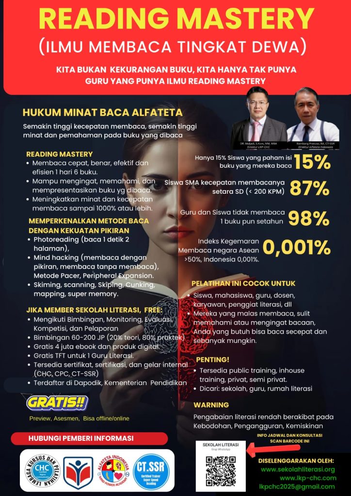 Literasi Membaca — Melalui metode SSRA (Super Speed Reading Alfateta) yang telah terbukti meningkatkan kecepatan membaca hingga 1000% tanpa kehilangan pemahaman.
