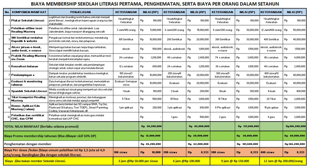 Sekolah yang memiliki minat dan komitmen namun tidak mampu, kami bantu mencarikan sponsor. Tapi hanya dapat dijalankan apabila ada sponsor. Syarat mengajukan permohonan bantuan penyelenggaraan sekolah literasi dengan sponsor.